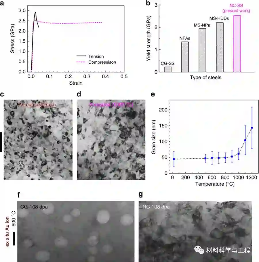 a,b: 纳米钢的压缩、拉伸力学行为;b: 纳米钢(NC-SS)与其它钢种的屈服强度对比;c,d,e: 纳米钢退火前后的晶粒尺寸;f,g: 粗晶钢、纳米钢辐照后的微结构对比
