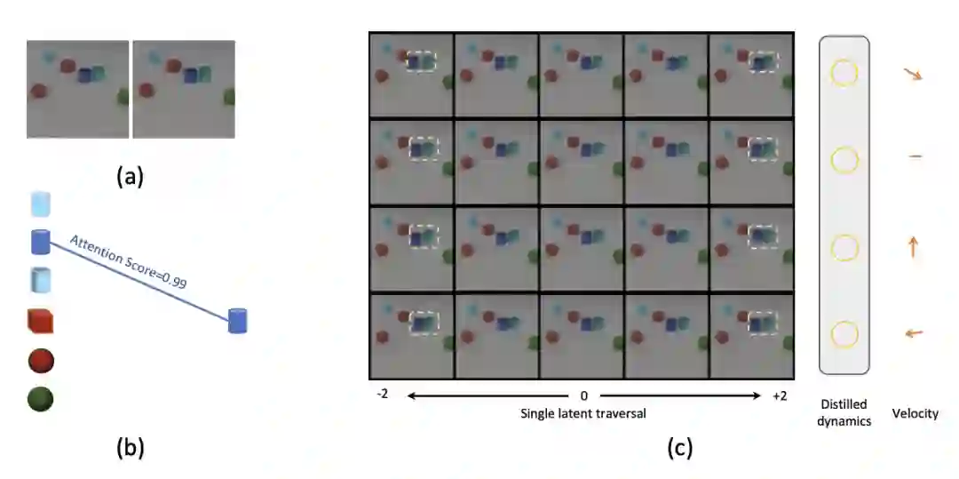 从生成模型的角度来说,已有的一些方法可以通过 VAE 框架对简单场景中的每个物体进行解耦表示,包括物体的形状、大小、位置等静态物理属性,这种对场景中不同物体的分离并解耦的表示方式对于下游任务有着很大的促进作用,增强模型对场景的理解和推理能力。
