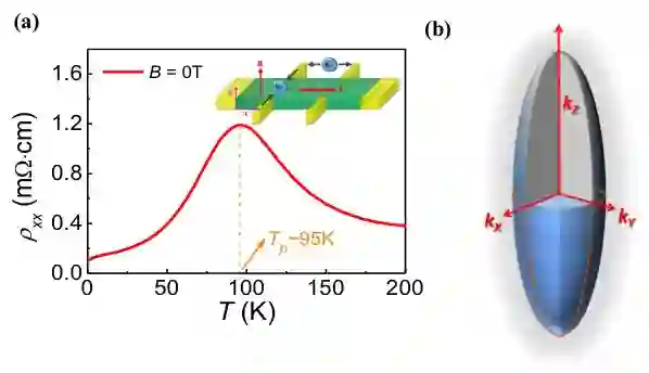 图1. ZrTe5单晶(Tp ~95K)的(a)降温曲线和(b)三维费米面结构。