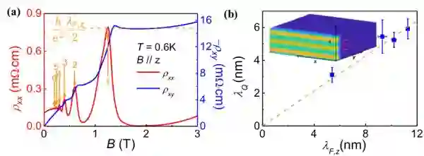 图2.(a)ZrTe5单晶中的三维量子霍尔效应;(b)z方向的CDW周期和费米波长,插图是三维电子气在磁场下形成二维导电层的模拟
