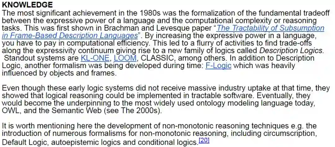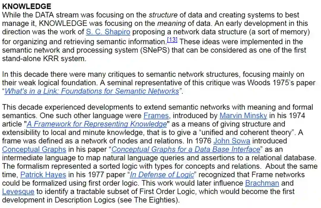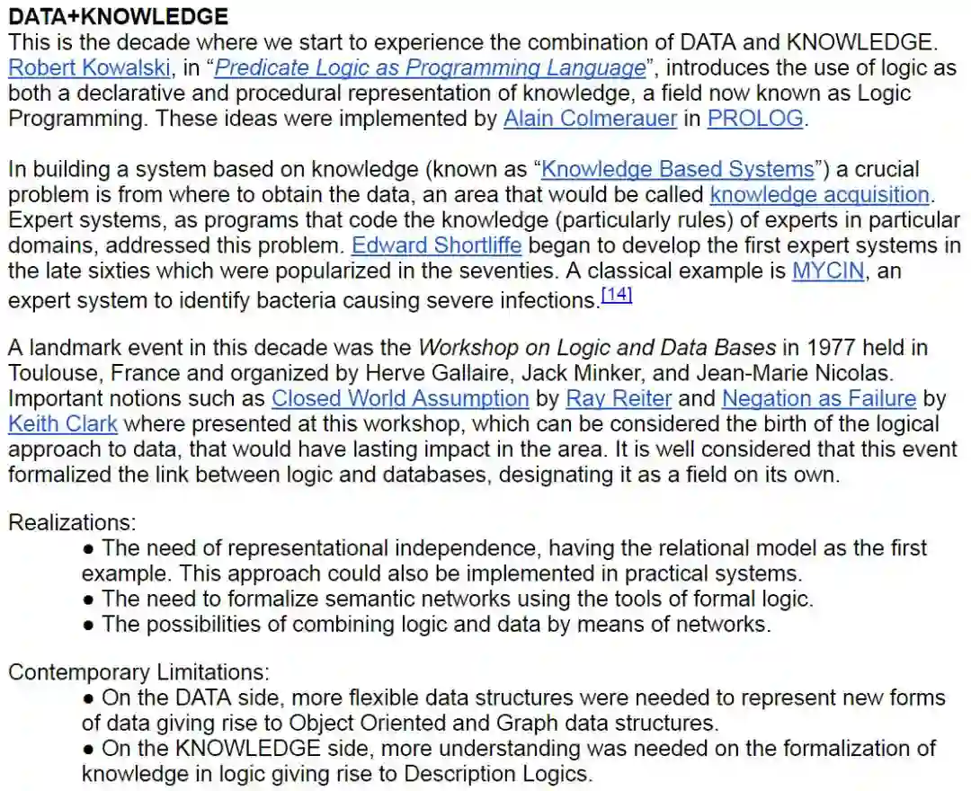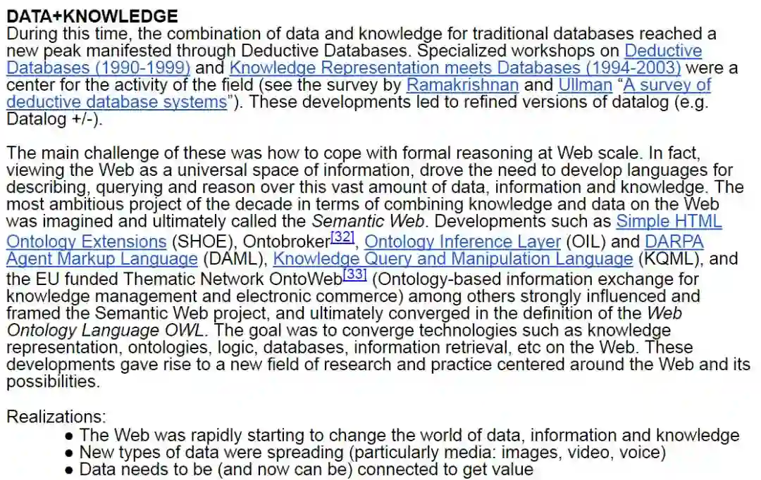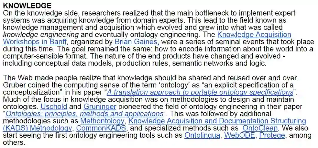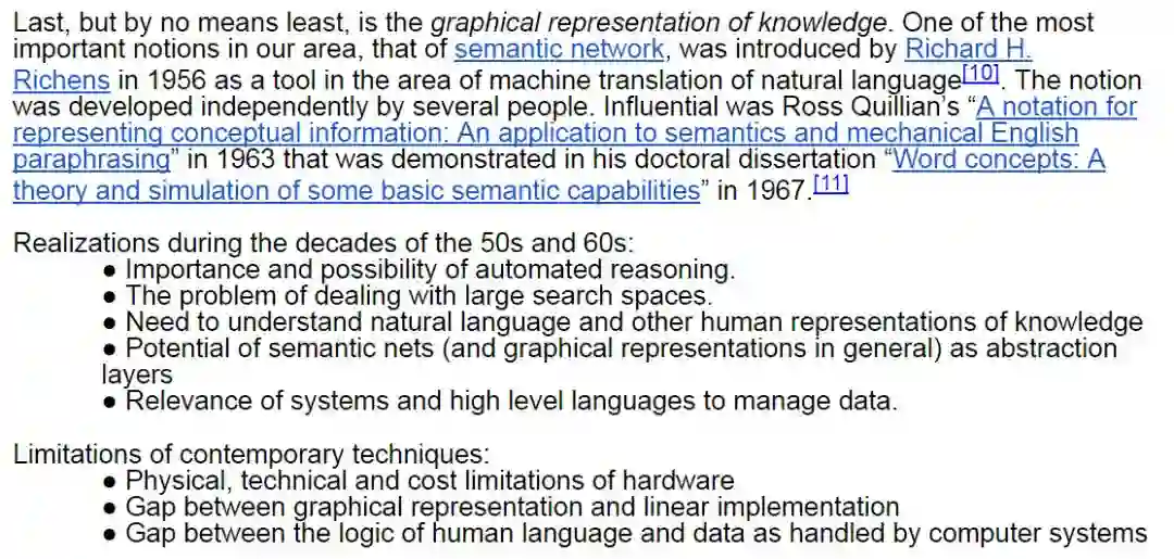 这份文档,结合18th International Semantic Web Conference的教程,提供了基于知识、数据及其组合的计算机科学学科进步的知识图谱的根源的历史背景。需要注意的是,这份文档不是一个综述survey(不一定涵盖所有方面),也不对关于这一主题的论文和系统进行系统的方法(定性或定量)分析。
