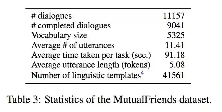 本文建立了一个对称合作对话任务数据集,数据集中知识库对应的schema 中包含3000个实体,7种属性。数据集的统计信息如下所示
