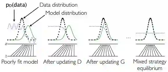 一个简单的例子如下图所示:假设在训练开始时,真实样本分布、生成样本分布以及判别模型分别是图中的黑线、绿线和蓝线。可以看出,在训练开始时,判别模型是无法很好地区分真实样本和生成样本的。接下来当我们固定生成模型,而优化判别模型时,优化结果如第二幅图所示,可以看出,这个时候判别模型已经可以较好的区分生成数据和真实数据了。第三步是固定判别模型,改进生成模型,试图让判别模型无法区分生成图片与真实图片,在这个过程中,可以看出由模型生成的图片分布与真实图片分布更加接近,这样的迭代不断进行,直到最终收敛,生成分布和真实分布重合。