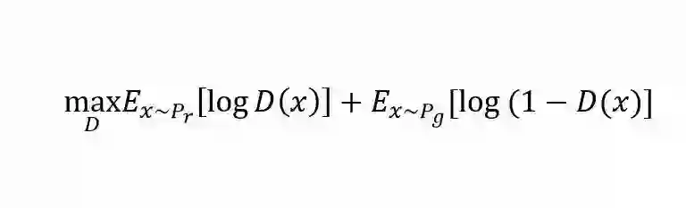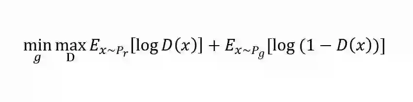 上述这种博弈式的训练过程,如果采用神经网络作为模型类型,则被称为生成式对抗网络(GAN)。用数学语言描述整个博弈过程的话,就是:假设我们的生成模型是g(z),其中z是一个随机噪声,而g将这个随机噪声转化为数据类型x,仍拿图片问题举例,这里g的输出就是一张图片。D是一个判别模型,对任何输入x,D(x)的输出是0-1范围内的一个实数,用来判断这个图片是一个真实图片的概率是多大。令Pr和Pg分别代表真实图像的分布与生成图像的分布,我们判别模型的目标函数如下: