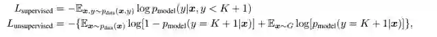 简单而言,目标函数针对不同数据,可以分为两部分。对于有标注的样本,目标是希望判别模型能够正确输出标签。而对于没有标注的生成样本,则是由GAN定义的loss。