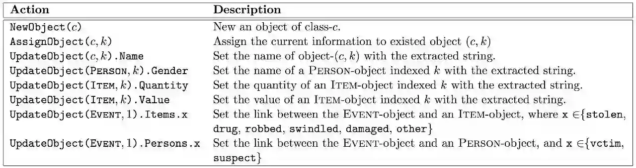 作者在三个数据集上对模型的性能进行了实验。以公安报案数据为例,OONP 使用了如图 6 中列举的 action。