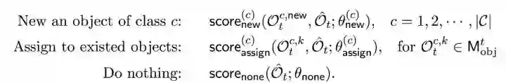 下面我们着重讲解一下 OONP 的离散操作。阅读器的策略网络输出的离散操作序列是形成本体结构主要操作。该操作集合包括三类,依照顺序分别是「新增-指派」,「选择更新属性」,和「更新内容」。当然,「新增-指派」操作后,也可以没有后续操作(空操作)。「新增-指派」可转化为多分类问题,如果提到内容是第一次出现,则「新增」,如果是已经出现过的,只是重新提及,则「指派」。具体的决策依赖于阅读器在创建的临时对象(公式中的)与已存在对象之间的相似度。具体公式如下: