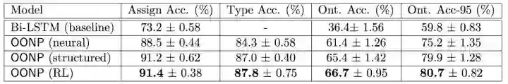 图 7 比较了 OONP 的不同实现:论文衡量模型性能用了四个指标,Assign Acc 表示预测对象「新增和指派」的正确率,Type Acc 表示预测对象属性的正确率,Ont Acc 表示单个样本解析的本体结构和标签 100% 重合的正确率,Ont Acc-95 表示单个样本解析的本体结构和标签 95% 重合的正确率。简单的 OONP 模型较以 Bi-LSTM 为基准模型有很大提升,具有丰富结构信息的 OONP(structured)则又有明显提升。而在 OONP(structured)的基础上,用强化学习来决定分类时机的模型 OONP(RL)则又进一步提高了效果。