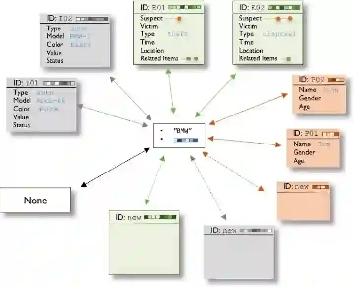 该框架借用面向对象编程(OOP)的思想,利用解析出来的实体组成对象和对象间关系(如图 1),构成结构清晰的本体图。每个对象 (object) 都是一个类 (class) 的实例化,类的概念规定了其具有的内部属性、外部关系和可执行的操作,以及与其他对象的关系类型。如图 1 所示,左边为叙事文本,右边为经过 OONP 解析生成的本体图。图例中共包含三个类的对象,分别为事件、人物、物品。人物类有姓名、性别、年龄属性,同时与事件对象有嫌疑人、被害人等表征人物角色的外部链接;物品类有名称、数量、价值等属性,与事件对象有表征物品角色的外部链接;另事件类有事件类型、时间、地点等属性。
