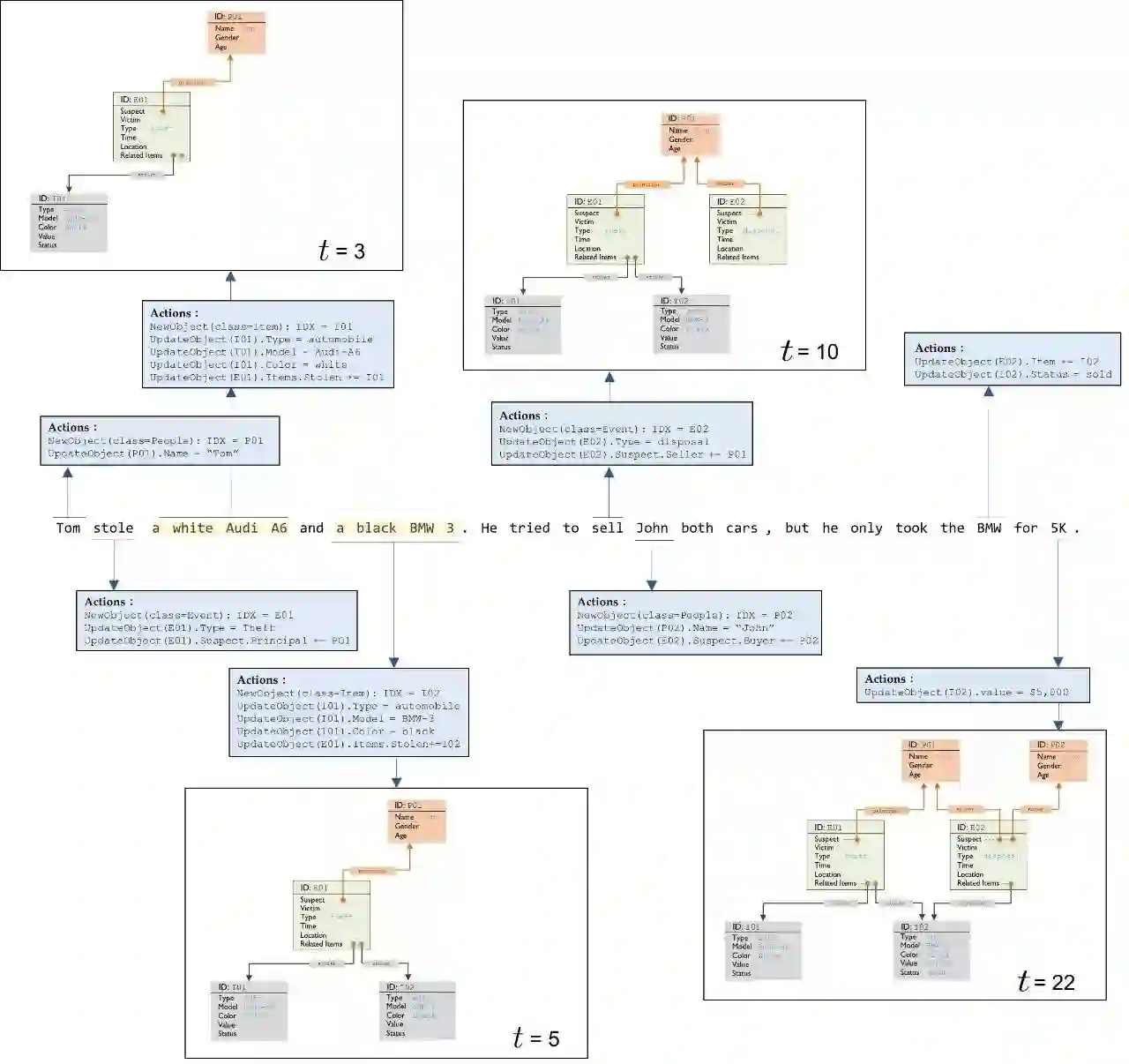 通过上述的三种操作,OONP 解析器可以对复杂的文档进行结构化解析。下面的图 5 给出了一段短文本解析的示例:OONP 解析器做通过一个动作序列,逐步形成了包含六个对象和六条链接的本体结构。