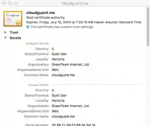 另外可以检查有没有被安装恶意证书 cloudguard.me,如果安装的话会看到: