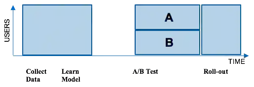 Netflix大部分的推荐机制都采用机器学习算法。以前我们会收集一批注册会员如何使用服务的数据,然后用这批数据训练一个新的机器学习算法。接下来用A/B测试法在当前的生产系统上测试这种新算法。A/B测试通过在随机子集上运行,可以让人们了解新算法是否比现有的生产系统更好。A组最终获得生产经验,B组获得新的算法。如果B组中的用户更喜欢泡在Netflix上,那么网站就会把这个新算法推广到整个用户群体。但不幸的是,这种处理方式产生了后悔(regret):长期以来,许多用户并没有体验到更好的服务。下图展示了这一过程:
