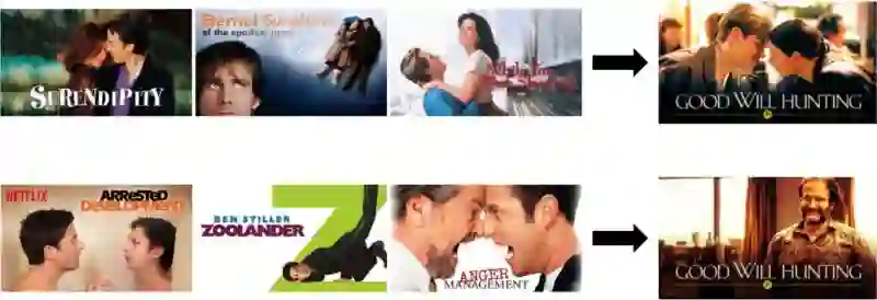 既然有了想法,那就让我们看一看定制化封面在现实中会产生怎样的效果吧。比如下面的例子,每一行左边都是某位用户曾经看过的影片,箭头右边是我们把电影《心灵捕手》(Good Will Hunting)推荐给他后,他可能看到的封面图。