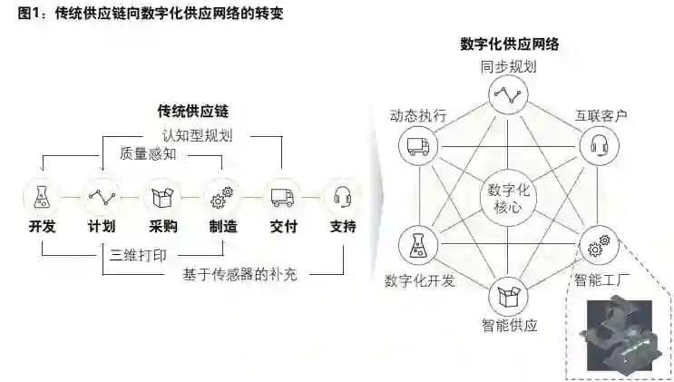 图1可以看到新数字化供应网络模型的互联网格线,数字化是其核心。该网络中,每个节点至其他各点都具有潜在的互动连线,能够促进各领域之间产生以前并不存在的更大程度上的互联互通。在这个模型里,通讯是多向的,在传统供应链中并未建立的连接之间创造了互联。