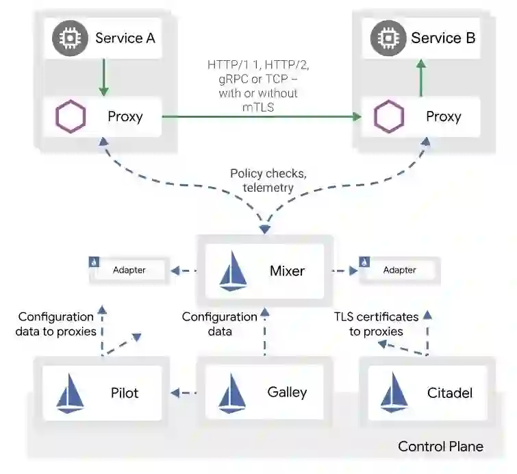 控制平面中,Galley 负责配置管理,Pilot 负责下发配置,Mixer 负责策略检查和遥测数据聚合,Citadel 负责通信中安全证书管理。