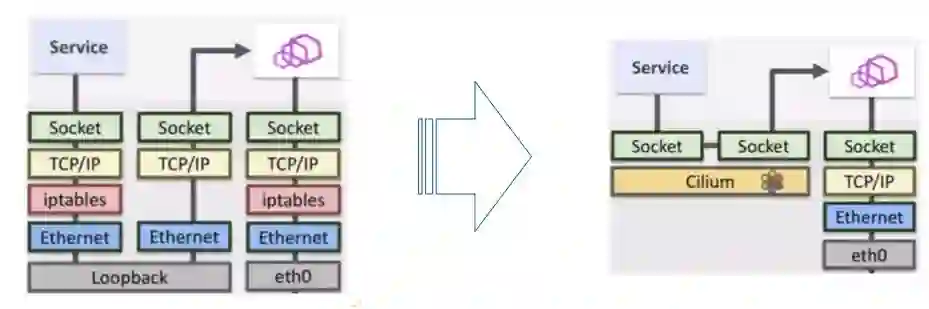 比如在 Cillium 容器网络中,可以利用 eBPF/XDP 等操作系统和底层网络能力,将应用层的服务控制能力(如 Kube-Proxy 提供的 service, network policy)下沉到操作系统内核和网络层解决,并优化了 Service Mesh 数据链路,减少上下文切换和数据拷贝,有效地减少了性能开销。
