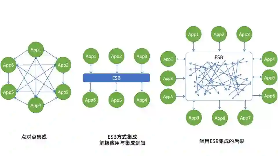大量服务集成的实现逻辑被下沉到 ESB 内部(如上图最右侧所示),这些逻辑非常难以维护,难以移植和扩展,成为 ESB 不可承受之重。