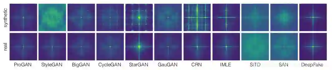 和Zhang Xu等人一样,作者也可视化了真实图像和合成图像的频谱图(如上图所示)。可以看出,真实图像的频谱图基本是一致的,虽然不同模型有所区别,但是都是类似笛卡尔坐标分成四个象限。但是CNN生成的图像则往往会在不同象限产生重叠的小点,这可能是在频谱域上与真实图像的不同。