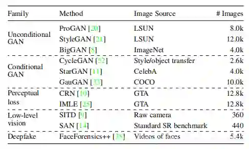 作者选出了11种GAN,涵盖了各种网络结构,数据类型和损失函数。这11种GAN生成的假图构成了一个大规模的评测数据集ForenSynths,下图展示了这些GAN生成的图像类型。