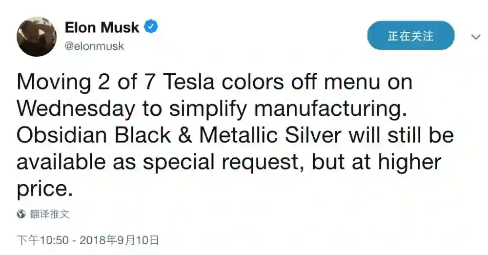 今天,马斯克发推特表示,从周三开始,特斯拉汽车的配色菜单将减少2两种配色,以简化生产,提高生产效率。同时,特斯拉仍将提供曜石黑(Obsidian Black)和金属银(Metallic Silver)两种配色,但价钱会更高。