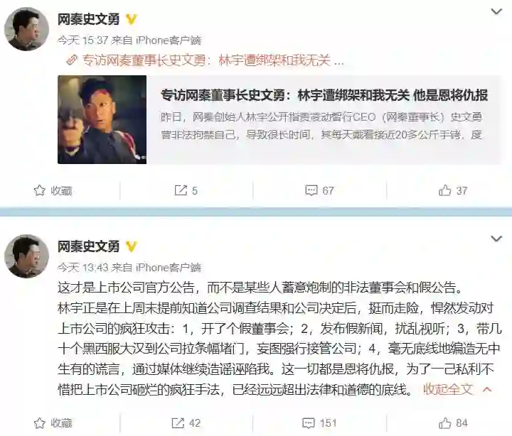 今天,史文勇又发微博回应这件事,称绑架事件和自己无关,并称林宇是造谣诬陷、恩将仇报。
