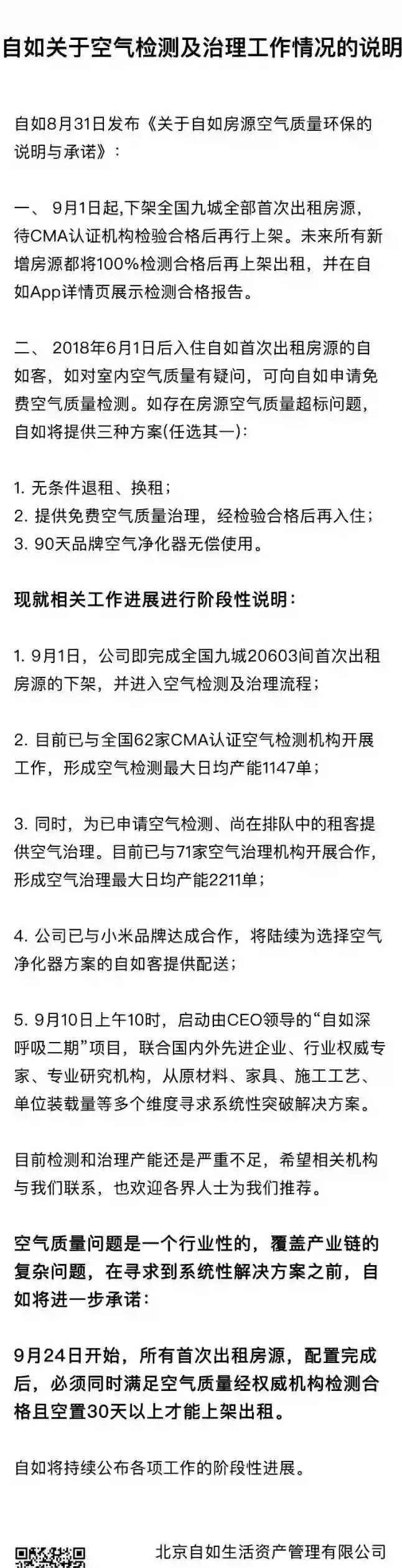 今天自如在其微博上发布了关于空气检测及治理工作情况的说明。大概是:自9月1日起,自如已经完成全国九城20603间首次出租房源的下架,并进入空气检测及治理流程;目前已与全国62家CMA认证空气检测机构开展工作,形成空气检测最大日均产能1147单。