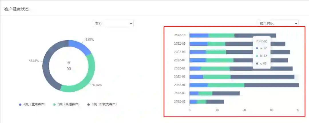 上周,我们团队一个产品同学在做CRM的数据统计的原型设计,其中有个功能是“客户健康状态”的堆叠条形图,希望能直观展示客户健康情况。