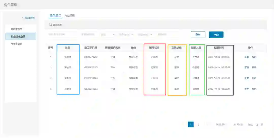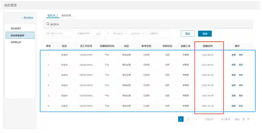 二是,列表展示完全体现不出来业务逻辑,关键的状态并没有做区分,如,“已禁用”的账号状态缺失、在职状态包括“在职”、“离职”也没有体现,仅仅是单纯的复制行数,让页面显得饱满而已,背后的业务逻辑和设计思维都没有体现。