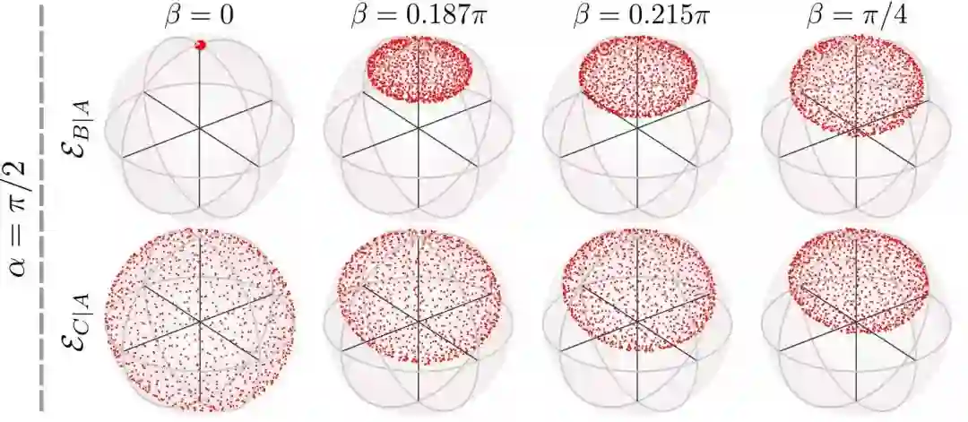 在共享的量子态不理想,或者多方共享量子态的情况下,Alice将不能将Bob的系统导引到任意的量子态上。此时Alice所能导引Bob的量子态的集合在Bloch表示下将构成一个椭球。我们知道单比特量子态可以可视化地表示为Bloch球中的一个矢量,而量子导引椭球则为两比特量子态提供了一个简单的可视化表示方法。在多方共享量子态的情况下,量子导引椭球具有体积单配性。例如Alice, Bob和Charlie共享一个三比特纠缠纯态,则Alice导引Bob和Alice导引Charlie的椭球体积存在一个简洁的单配关系,即改变参数使一个导引椭球的体积变大时,另一个导引椭球的体积则会变小。