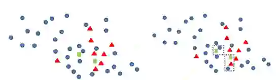 对于新产生的青色数据点与其他非青色样本点距离最近的点,构成一对 Tomek link,如图框。