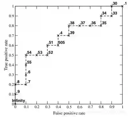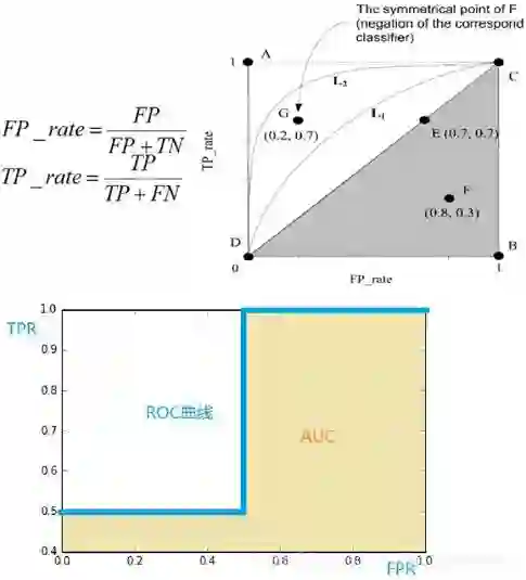 考虑 ROC 曲线图中的四个点和一条线。第一个点(0,1),即 FPR=0, TPR=1,这意味着 FN(false negative)=0,并且 FP(false positive)=0。Wow,这是一个完美的分类器,它将所有的样本都正确分类。第二个点,(1,0),即 FPR=1,TPR=0,类似地分析可以发现这是一个最糟糕的分类器,因为它成功避开了所有的正确答案。第三个点,(0,0),即 FPR=TPR=0,即 FP(false positive)=TP( true positive ) =0 ,可以发现该分类器预测所有的样本都为负样本(negative)。类似的,第四个点(1,1),分类器实际上预测所有的样本都为正样本。经过以上的分析,我们可以断言,ROC 曲线越接近左上角,该分类器的性能越好。