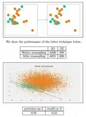 Tomek Link Removal:如果有两个不同类别的样本,它们的最近邻都是对方,也就是 A 的最近邻是 B,B 的最近邻是 A,那么 A,B 就是 Tomek link。我们要做的就是讲所有 Tomek link 都删除掉。那么一个删除 Tomek link 的方法就是,将组成 Tomek link 的两个样本,如果有一个属于多数类样本,就将该多数类样本删除掉。