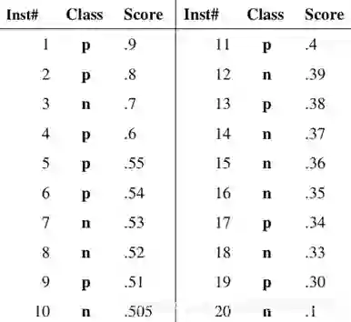 In signal detection theory, a receiver operating characteristic (ROC), or simply ROC curve, is a graphical plot which illustrates the performance of a binary classifier system as its discrimination threshold is varied。20 个测试样本,“Class”一栏表示每个测试样本真正的标签,p 表示正样本,n表示负样本),“Score”表示每个测试样本属于正样本的概率。