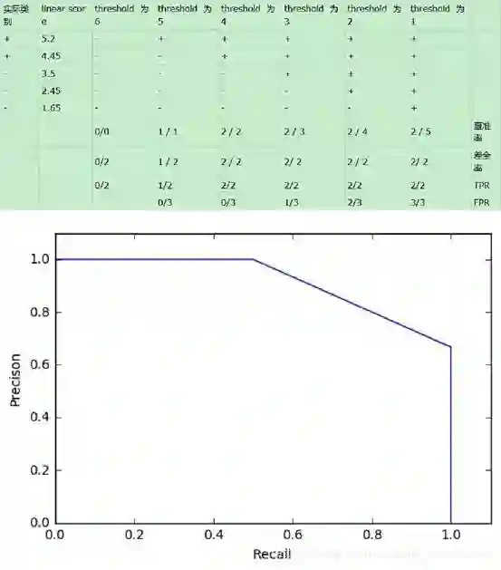 其实,我们并不一定要得到每个测试样本是正样本的概率值,只要得到这个分类器对该测试样本的“评分值”即可(评分值并不一定在(0,1)区间)。评分越高,表示分类器越肯定地认为这个测试样本是正样本,而且同时使用各个评分值作为threshold。
