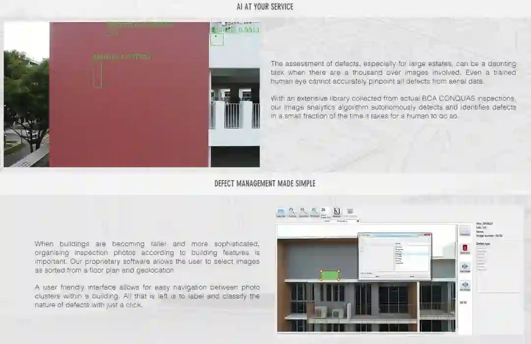 无人机+人工智能,提供楼宇整体检测方案,定制化的软件界面,方便快捷的浏览检测结果和整体报告。