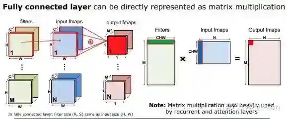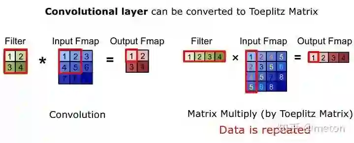 全连接层可以直接转化为矩阵乘法,因为全连接的操作本质上就是Y=WX的矩阵操作。从另一个角度,全连接的操作其实还可以看作 每个神经元为1x1filter,所进行的卷积操作。而对于卷积层,转化为矩阵乘法后,会引入一定冗余度: