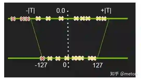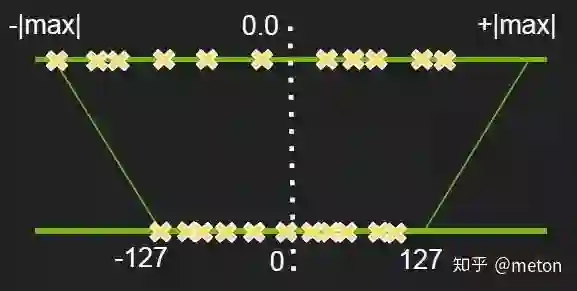 根据上图,最简单的理解方式就是:统计网络权重和激活值的取值范围,找到最大值最小值后进行min-max映射把所有的权重和激活映射到到INT8整型范围(-127~128).