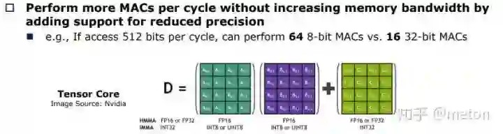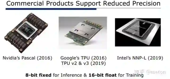 进一步,有些CPU/GPU支持INT8 INT16低精度运算,在取相同的数据量情况下,还可以进行更多的乘法运算(4个INT8 相当于原先一个 FP32所占的空间)。