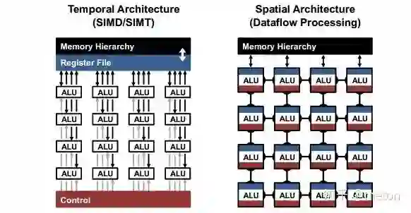 SIMD和SIMT本质上是一种时间上的并行展开,属于Temporal架构,怎么理解呢?就好比一个循环并行,我每个并行计算单元做的是某次迭代的事,相当于把通用CPU在一段时间内的循环操作在我们的加速器的并行单元上一次性展开了。