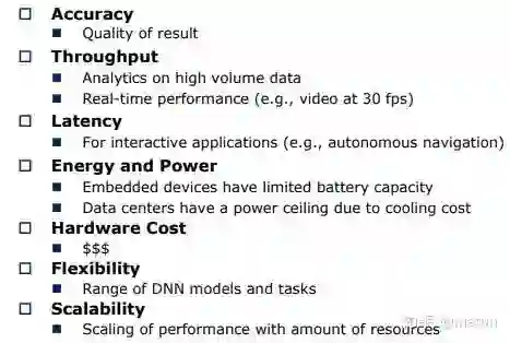 DNN加速器的关注的点不仅仅是 OPS/W,更多的是准确度、吞吐量、时延、功耗、硬件成本、硬件的灵活度或者说对新出现模型的可复用性等等各个方面的权衡。