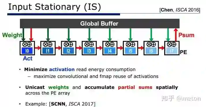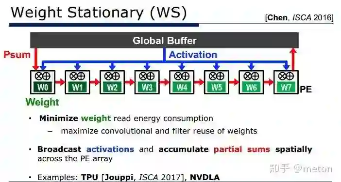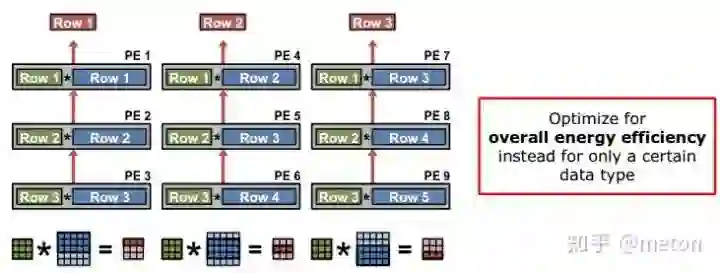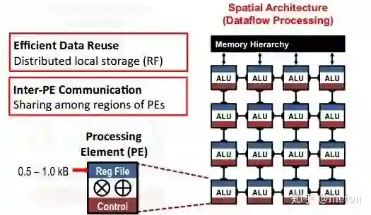 提高PE的利用率. 意思是尽量使得PE忙碌,一个方法是增加片上缓存大小,提高访存总线宽度等等入手,这些都旨在减少访存的瓶颈,PEs可以更快拿到数,减少等待时间;另一种方式是让数据尽可能在数据通路中多停留,这样在访存能力不变的情况下,就可以用流水线的形式让PE尽可能有事做,后面讲解的TPU所用的脉动阵列,和流行的 DtaFlow数据流架构都是类似方式,当然在GPU的设计上也可以融入上述通用思想.