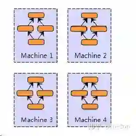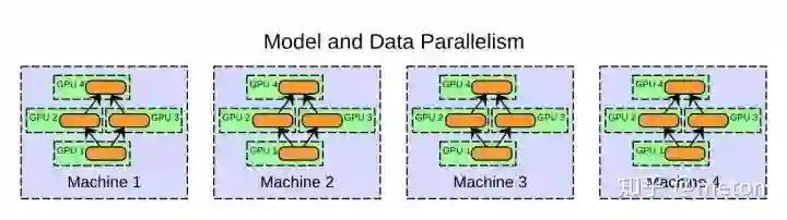 当然实际上还会有数据并行和模型并行的结合,可以从这个角度理解: 模型各个部分分散在单机的多个GPU中(模型并行),同时模型在多个机器都有副本,数据各个部分分别喂给各个机器并行训练(数据并行)。