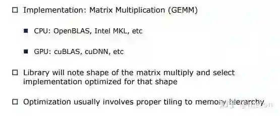 现有的CPU和GPU都有官方的加速库来加速矩阵运算。CPU和GPU为了支持DLP行为,有专门的向量指令集,例如CPU的SIMD指令,不过SIMD毕竟是通用处理器对DLP的补充,并行度其实不算太高;还有就是GPU的SIMT,其实本质上是SIMD的一种不同的抽象方式,并且借助GPU大量的运算核心,在并行度方面远超支持向量处理的CPU。