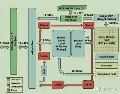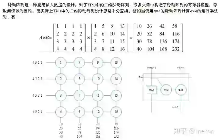 TPU使用了脉动阵列,这是一个很有趣的点,脉动阵列在很早之前就已经出现,后来被认为实用性不大,但是在深度学习时代,计算密集的大矩阵运算让脉动矩阵焕发活力,可以算是加速器设计的重新考古发现。关于脉动阵列的计算方式可以参考https://github.com/meton-robean/PaperNotes/issues/3