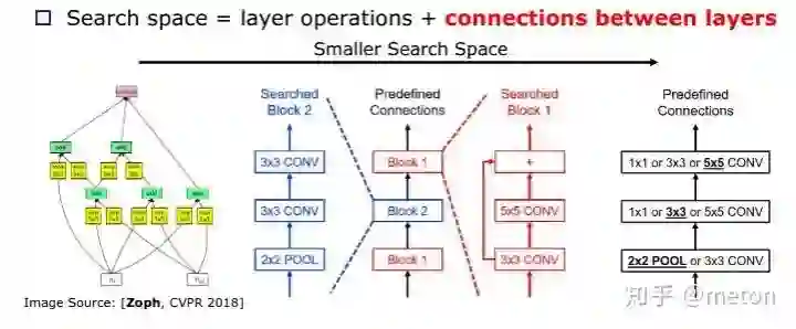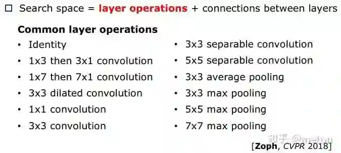 可以通过增加一些搜索约束来减少探索空间,例如 权衡架构的宽度;放低所要达到的性能目标;结合domain knowledge,通过现有的人工设计经验来缩小探索范围。下面是一种搜索的例子,将设计空间设定为 layer operations和 layer connections的不同组合,然后NAS系统在人工设计的几种选择组合选项中进行搜索: