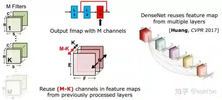 直接减少的filter数目虽然可以减少参数,但是导致每层产生的feature map数目减少,网络的表达能力也会下降不少。一个方法是像DenseNet那样,一方面减少每层filter数目,同时在每层输入前充分重用之前每一层输出的feature map。