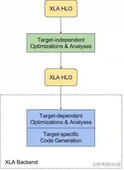 到后端去做进一步的HLO级优化,HLO级优化会针对硬件目标特定信息和需求,如XLA GPU后端的算子融合、确定如何将计算划分为流。此阶段,后端还可以将某些算子或其组合与优化的库调用进行模式匹配。