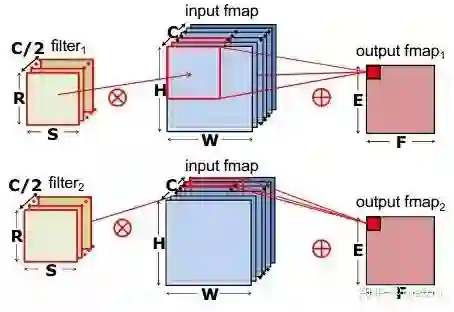 第二种方式:group convolution,将feature map的通道进行分组,每个filter对各个分组进行操作即可,像上图这样分成两组,每个filter的参数减少为传统方式的二分之一(乘法操作也减少)。