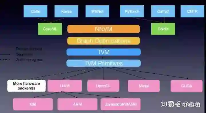 GPU后端目前通过LLVM NVPTX后端支持NVIDIA GPU,CPU后端支持多个CPU指令级架构( ISA)