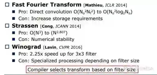 使用其它的卷积近似替代算法,可以减少复杂度。不过有些算法有使用条件,像Winograd只是对小卷积核操作有比较大的优化效果。傅里叶变换似乎不太常用,因为要达到理论上的加速,要求卷积核要很大才可以,而实际上深度学习用的都是小卷积核。
